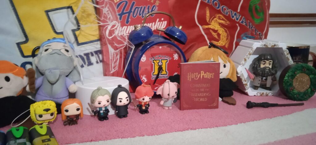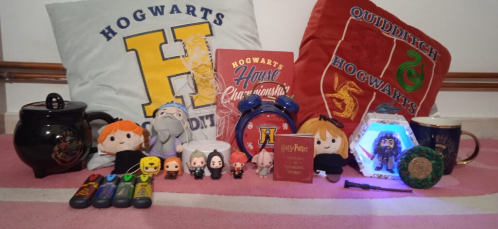 Ca să înțelegi cât de fangirl sunt în raport cu această serie, am să enumăr o parte dintre obiectele pe care le am: cărți, pătură, perne, lampă, ciocolată, figurine, farfurii, căni, boluri, ceaun, tacâmuri, paie, ceas deșteptător, stickere, agendă, carte poștală, blazon, geantă, ciorapi, tricouri, bluze, pantaloni, pijamale și nu în ultimul rând chiloți. Recunosc, sunt ușor ipocrită când vorbesc despre cât de rău este consumerismul, iar imediat ce văd un obiect cu inițialele HP încep să îmi curgă bale în colțul gurii. Dar na, fiecare cu viciul său la sfârșitul zilei…
