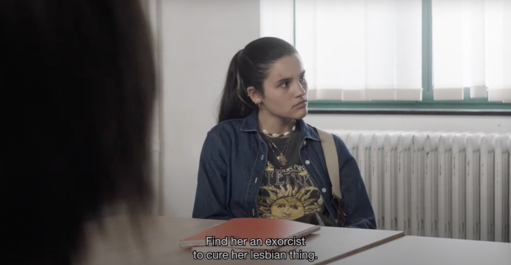 În clasa la care predă Amal nu va fi vorba, însă, de un bullying… clasic, să-i spunem așa. Factorul extrem de sensibil care există acolo e religia. Monia nu e doar o „freak”; colegii nu vor să afle ce face și cum face cu o altă fată și nici dacă e atrasă de colega de bancă; sau de oricine altcineva. Nu. Pentru o parte a colegilor, musulmani practicanți (să nu uităm, și Amal e musulmană), Monia e întruchiparea răului. Ea trebuie să dispară. O idee în privința asta apare pe un bilețel pasat – nu foarte discret – între colegi, pe care e un desen cu o fată aruncată de pe un bloc.