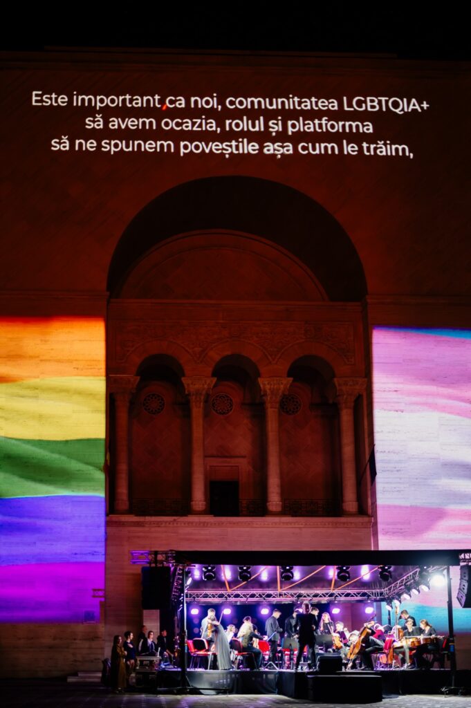 În momentul proiecției, în Piața Victoriei erau oameni de toate vârstele, unii care știau și susțineau proiectele Identity.Education de mai mult timp, alții erau ajunși acolo din întâmplare. Am povestit cu Adriana și Luminița, ambele în vârstă de 53 de ani, care au stat front row pe tot parcursul proiecției. Adriana venise pentru că se consideră un aliat al mișcării LGBTQIA+ și își dorește să crească înțelegerea și acceptarea în societate în ceea ce privește comunitatea, iar Luminița trăiește de câțiva ani în Melbourne, Australia, unde a observat diferența de percepție asupra comunității.