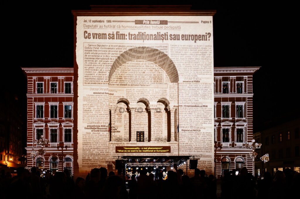 Pe 14 octombrie, în Piața Victoriei din Timișoara a avut loc premiera documentarului-concert „Liberatate?”, o oglindă pentru comunitatea LGBTQIA+ din România, un loc în care istoria ascunsă a acestei comunități a fost adusă la lumină, iar traumele rămase în timp au fost readuse în discuție. Dar premiera nu a fost o proiecție clasică, ci a însemnat o experiență multisenzorială. Proiecția a însemnat, de fapt, o mapare video pe clădirea Palatului Culturii din Timișoara, acompaniată de muzică special compusă.
