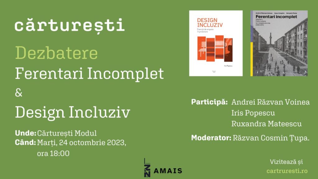 Marți, 24 octombrie, de la ora 18:00, va avea loc o dezbatere și o dublă lansare de carte: 𝘍𝘦𝘳𝘦𝘯𝘵𝘢𝘳𝘪 𝘐𝘯𝘤𝘰𝘮𝘱𝘭𝘦𝘵, volumul 1: Politici urbane la margine de oraș și 𝘋𝘦𝘴𝘪𝘨𝘯 𝘪𝘯𝘤𝘭𝘶𝘻𝘪𝘷, Exerciții de empatie în proiectare.