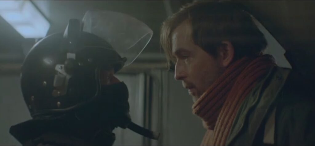 În continuare asistăm la 40 de minute de incompetență profesională din partea autorităților (și un caz de abuz, dar nu asupra protagonistului – de ce nu investigăm mai mult povestea bărbatului bătut până la inconștiență din duba jandarmilor?), timp în care protagonistul nostru e amenințat puțin, înregistrat în baza de date, încarcerat, după care eliberat, cedând și colaborând cu poliția în propria-i incriminare (acceptă să dea mărturie că a luat parte la proteste). I-aș fi urmărit mai degrabă pe oricare dintre ceilalți cetățeni ridicați de către jandarmerie, căci în scurtele momente în care au apărut pe ecran, au reușit să se impună ca personaje complexe mai mult decât a reușit Sami de-a lungul întregului film. E genul de om care trece prin viață fără să reacționeze măcar la ce i se întâmplă, nici că s-ar pune problema luării proactive de decizii în propriu-i demers. Parcursul lui emoțional e inexistent, iar explorarea mediului nou și periculos în care e târât înainte de a avea timp să reacționeze e superficială și nesatisfăcătoare. Sami nu înregistrează nimic din ce se petrece în jurul lui în duba jandarmeriei sau la secția de poliție – acum, când această pușcă a lui Cehov ar fi putut așa de îndemânatic fi folosită pe deoparte pentru a lega tematic filmatul și protestele, pe de altă parte ca act de rebeliune cu scopul conturării personajului. Dar deja „îmi fac filme”.