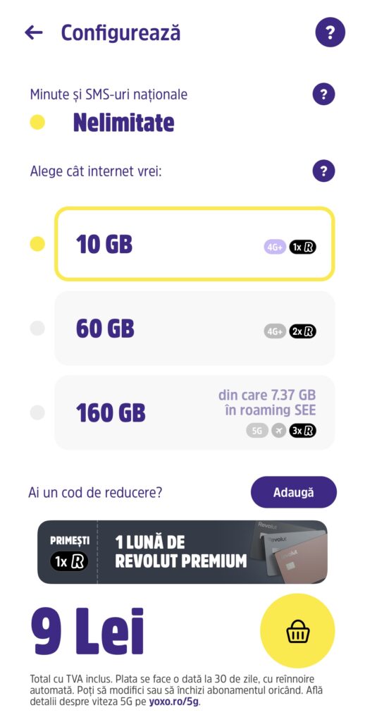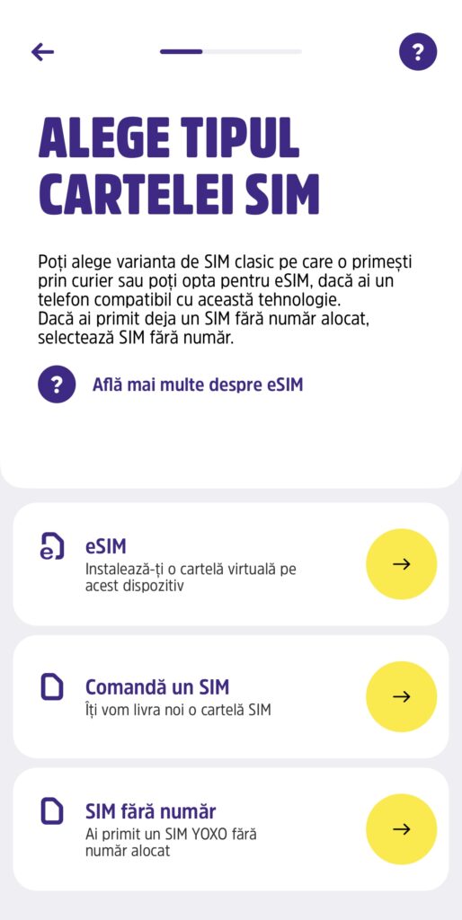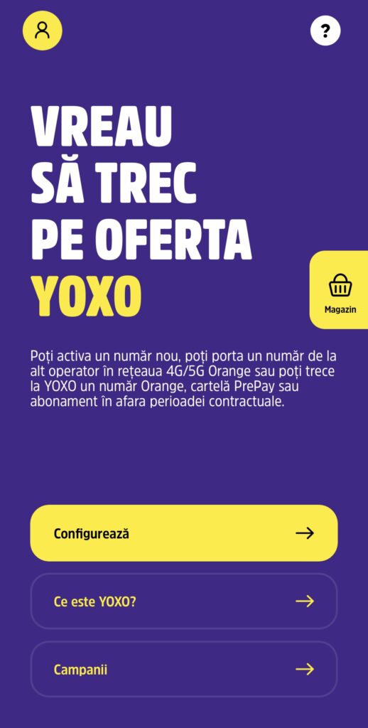 În funcție de ce alegi aici, pașii următori se schimbă puțin. Dacă vrei un număr nou de telefon și telefonul tău suportă asta, vei primi un eSIM, o cartelă virtuală, sau YOXO îți va trimite o cartelă fizică (din materiale reciclabile). Alegi abonamentul care îți sună bine, lași a doua cafea pe zi pentru altă dată și ai un abonament la YOXO cu nouă lei.  Unde mai pui că orice modificare vrei să faci sau să adaugi extra opțiuni, ai totul accesibil și ușor de folosit în aplicație.