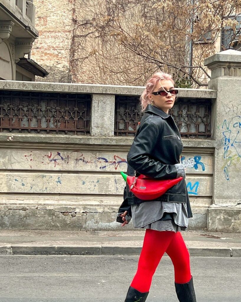 - Starting off strong, avem accesoriile și hainele în culoarea roșie. Clean girl aesthetic is over, așa că e timpul să readucem culoare în outfiturile noastre. O vom regăsi în topuri, fuste și chiar accesorii precum cel de mai jos. Aici putem observa cât de mult se transforma un outfit doar printr-o pată de culoare. Dresurile roșii sunt acum la modă, iar combinate cu o geantă de aceeași culoare fac acest look inedit. Bonus points pentru orice este în formă de fruct (yummyy).