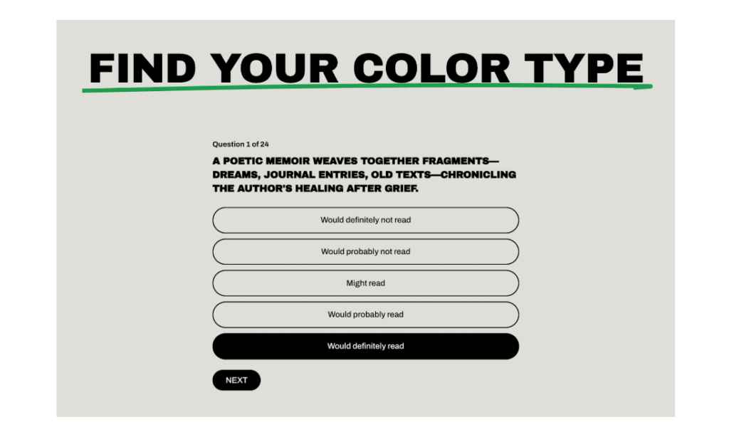 Recent, Steven James Reese, cititor care postează des conținut pe TikTok, s-a viralizat prin propunerea sa inovativă: Read your color, un test care dezvăluie ce culoare ți se potrivește ca cititor. Practic, 6 culori devin categorii de genuri literare, emoții sau vibes, iar tu testezi care dintre acestea se aseamănă cel mai bine cu preferințele tale. E ca un test de personalitate pentru cărți, un test de 3 minute în care selectezi cât de mare ar fi probabilitatea citirii unor cărți în baza a 24 de descrieri. Testul este simplu, gratuit și disponibil pe platforma inițiată și programată de el, unde primești niște numere și culoarea dominantă. Categoria îți este explicată și primești și câteva recomandări de cărți. Videoclipul original a ajuns acum la 1.9 milioane de vizualizări.