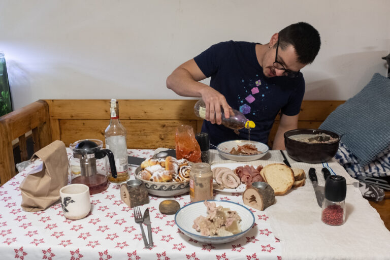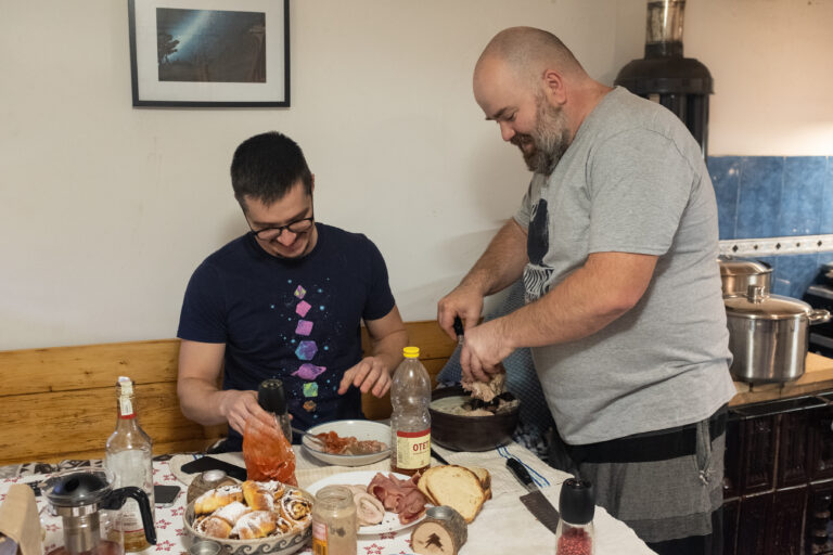 Bem o cafea, Cristi face o ratută cinstită – pentru cititorii care nu-s din Ardeal, a se citi omletă –, pe care o mâncăm cu fleică și murături făcute de el, și începem să povestim. Ioi! Ce dor mi-o fo die accentu-aista!, îmi zic în timp ce îi aud vorbind. Atmosfera mi-e cumva străină și totodată familiară. Eu și ai mei ne petrecem Crăciunul la țară, la bunici, și în ultimii ani am împodobit bradul în dimineața ajunului, înainte să plecăm.