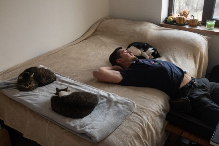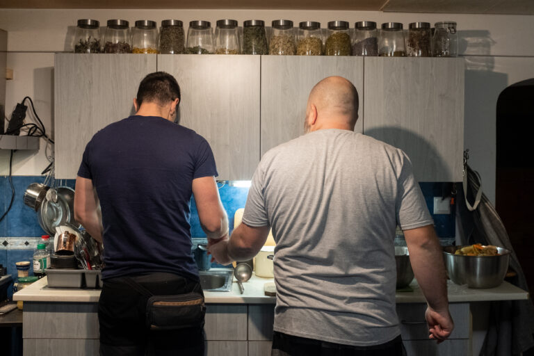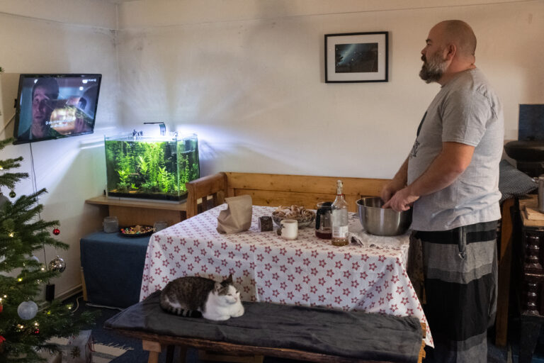 Paul are de lucru, iar eu rămân cu Cristi la bucătărie. Plănuiam să ajut, dar ajung să mângâi cele trei pisici: Garu, Pițu Mare și Gatto. Cristi s-a mutat din Cluj în casa bunicii din Sălicea în 2003 și a locuit cu ea aici până în 2018, când a murit. În timp, a construit casa nouă în prelungirea încăperii în care ne aflăm, iar acum, la etaj, există o cameră terminată, care e atelierul lui Paul. Vorbim despre familie, depresie, alcool, prieteni. Despre cum poți să cunoști mai bine un om în funcție de cum joacă boardgames.