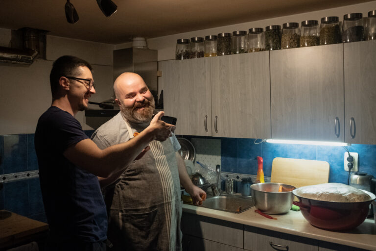 Ajung în fața porții lui Cristi Marcu. Aici mă întâmpină Paul Mureșan, ilustrator și animator, care, împreună cu Ana Kun, mentorează echipa de ilustrație de la Gen, revistă. Facem cunoștință și intrăm în casă. Cristi sau Bursucu – așa cum îi spune Paul – e în bucătărie, acoperă cu o folie aluatul de pâine pe care tocmai l-a frământat.