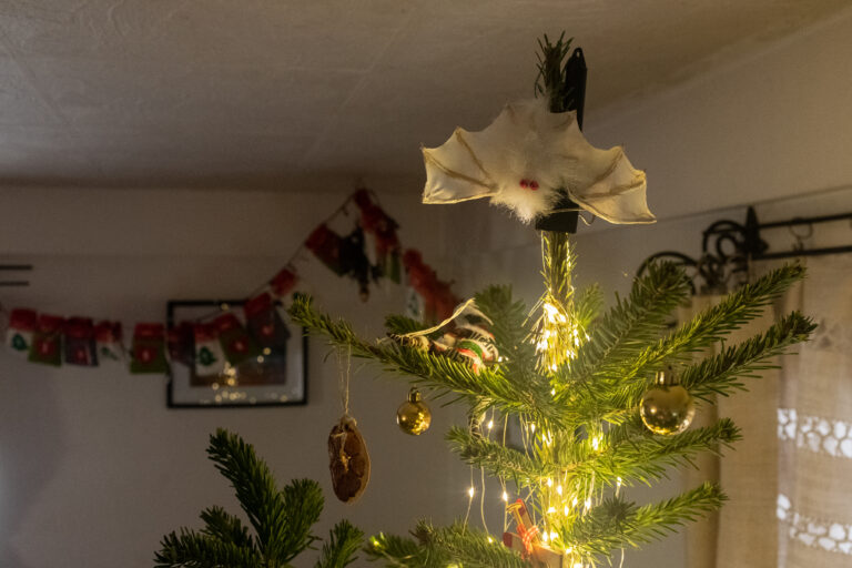 Când intru în casă, îmi sar în ochi beculețe, ghirlande și un brad cu decorațiuni handmade sub care sunt aranjate cadouri de toate felurile. Pe masă trei lumânări aprinse încadrează un bol cu ruladă dulce și cornulețe făcute de Cristi. Când una dintre lumânări se stinge, Paul se grăbește să o înlocuiască.