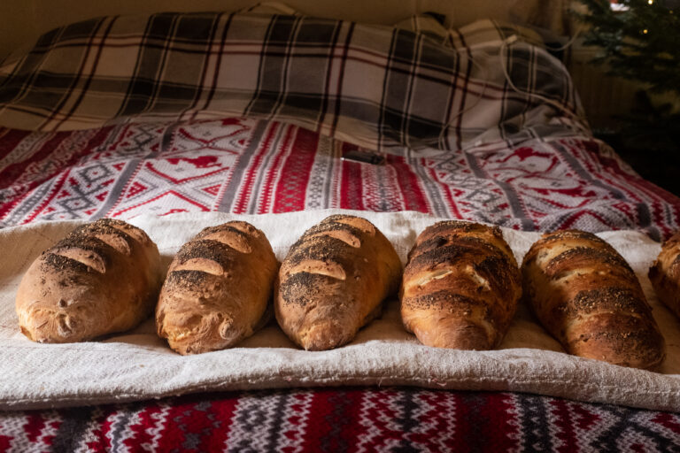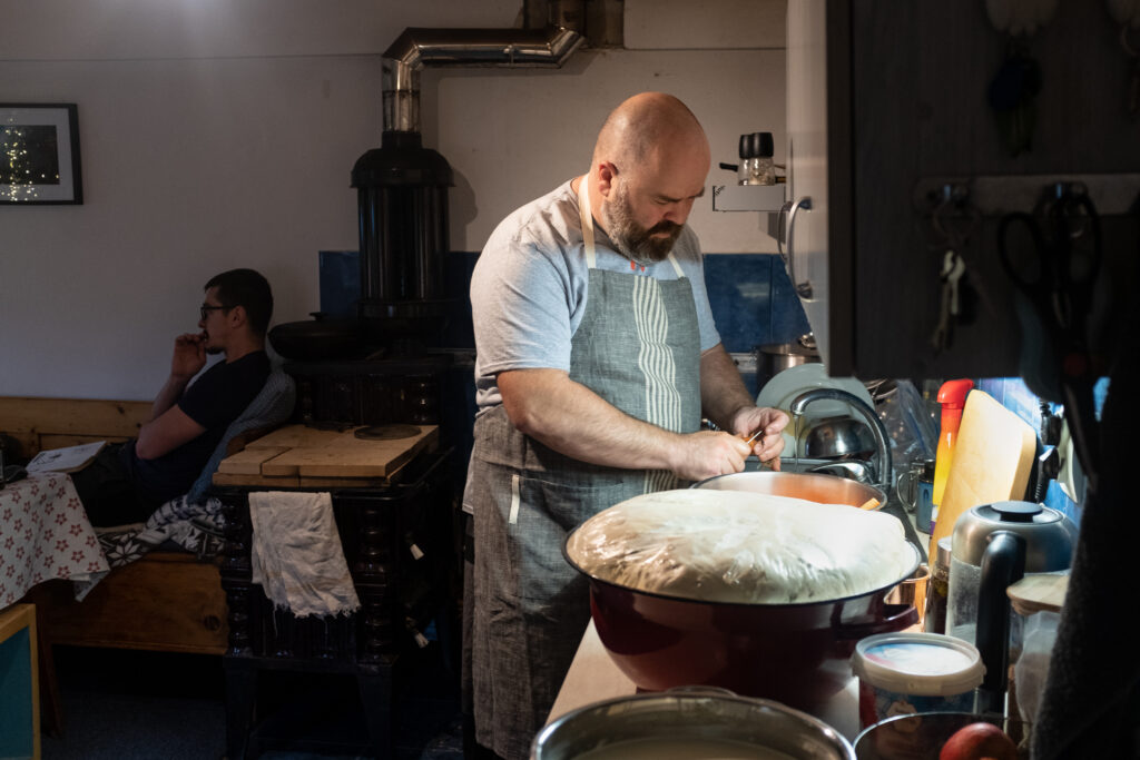 Când aluatul cu semințe dă să iasă din vasul imens – căruia bunica mea i-ar zice vailing –, Cristi îl mai frământă puțin și îl acoperă din nou. Repetă mișcarea de trei ori pe parcursul dimineții și pe la prânz se apucă de modelat pâinile. Sâmbăta trecută o prietenă din sat a organizat un târg de Crăciun unde sătenii doritori au vândut produse făcute de ei. Cristi a dus pâine, cornulețe, miere de la albinele lui, roșii uscate, funduri de lemn făcute de el și printuri cu ilustrații de-ale lui Paul. Deși a fost foarte frig, a venit lume multă, nu a avut răgaz să stea în casă și acum e răcit. Cel mai bine s-a vândut pita. Acum face douăsprezece pâini, dintre care opt sunt pentru cineva din sat.