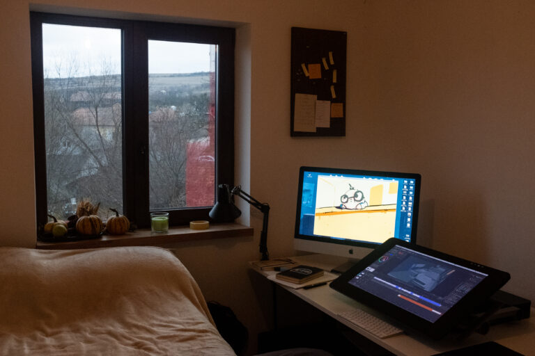 În atelierul lui Paul, cele trei pisici stau pe patul unde dorm de obicei prietenii care vin în vizită. Paul lucrează la o animație și îmi arată programele pe care le folosește. Pentru o animație, desenează în general mii de pagini, pe hârtie, dar în ultima vreme experimentează digital. Deși urăște senzația de a „desena pe plastic”, îi place că are tot felul de instrumente care îi salvează mult timp. Schițează rapid câteva cadre ca să-mi arate cât mai exact ce tip de dinamică îi place să dea animațiilor lui.