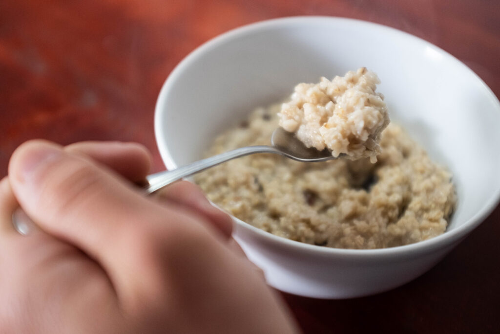 Dimineața, înainte de micul dejun, fac yoga pentru slăbit, apoi mănânc cu mama și fratele meu. Fratele meu are o farfurie cu omletă și mult cașcaval. Îmi amintesc că, până să îmi doresc să slăbesc, mama îmi pregătea și mie omletă. Iubeam acel cașcaval topit. Acum îmi pregătesc seara terci de ovăz. Este foarte popular pe Instagram să mănânci oatmeal dimineața – e sănătos și nu îngrașă.