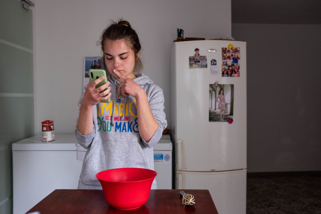 Mă trezesc la 6:30. Mă așez pe cântar. Aceeași greutate ca ieri – mulțumitor. Fac sport, mănânc un măr și mă apuc de lucru – învăț pentru bacalaureat. Orele încep la ora 9:00. La prima pauză, merg să iau din frigider gustarea pregătită de mama – fructe tăiate felii. Le înfulec în timp ce dau scroll pe Instagram. Continui să învăț și să particip la ore. Pe la 12:00, mi se face foarte foame, dar aștept până la 14:00, când mama vine de la serviciu. Mâncăm prânzul împreună. Mama mănâncă ciorbă și felul doi. Eu mănânc legume la cuptor sau supă cremă.