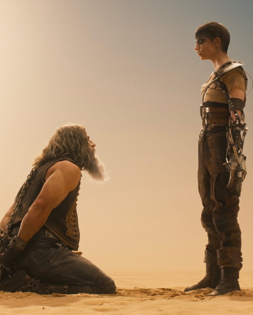 În Furiosa, cuvintele sunt plăcerea antagonistului, Dementus (Chris Hemsworth într-un rol negativ și, uhm, dement, care i se potrivește ca o mănușă). El vorbește. Mult. Are mereu megafonul la îndemână (și un urs de pluș prins de costum) și strigă cele mai mișto replici din film. Imaginează-ți doar: ești la un film Mad Max și auzi un personaj cu înfățișarea lui Chris Hemsworth, dar mai sălbatic, urlând maniacal ladies and gentlemen, let’s start the engines! Da, știi că o să urmeze ceva cool.