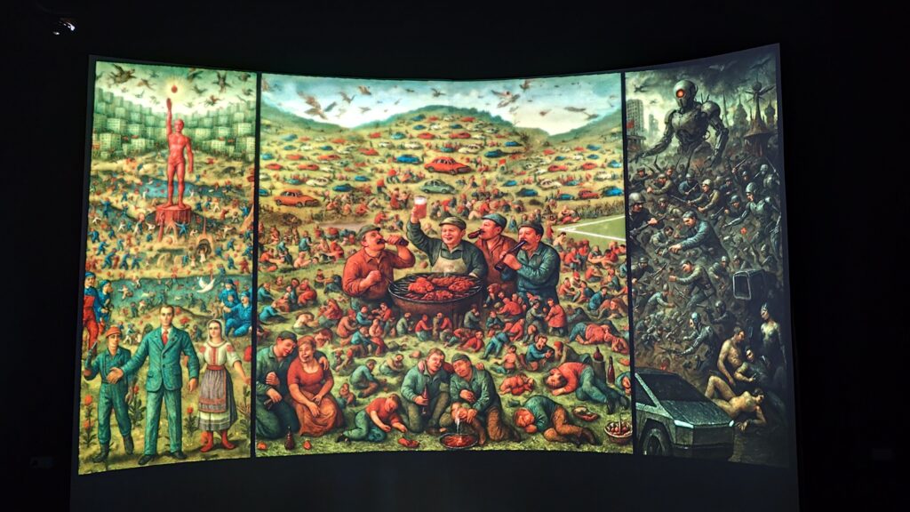 Recunosc că și eu am intrat prima dată și era întuneric în jurul meu, doar un ecran mare împărțit în trei părți. N-am știut inițial la ce mă uit, însă chiar și fără să știu povestea din spate, câteva chestii mi-au atras atenția în vizual: în stânga, o femeie îmbrăcată tradițional, un domn la costum, un muncitor, blocuri gri, un om ce e un fel de Dumnezeu pentru restul și muuulți oameni. Pe mijloc, niște oameni care se simțeau bine la un grătar. Iar în dreapta, o imagine de război, cu blocuri gri, oameni căzuți și roboți. Cât încercam să mă prind ce vedeam de fapt, Lucia Codreanu mi-a venit în ajutor. E parte din asociația Unda Obscură și mi-a fost ghid în fiecare cameră a expoziției.