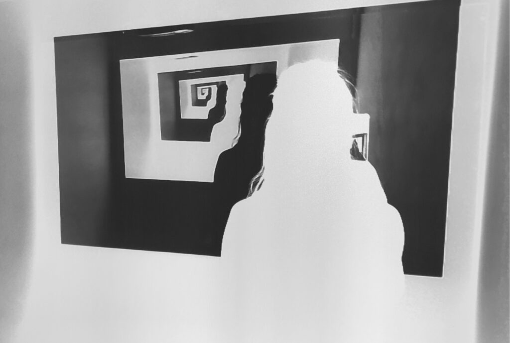 După experiența micului, am mers la Ghișeul 10. Instalația a treia presupune o cameră ce surprinde omul din fața ei, îl proiectează pe instalație, iar cu ajutorul delay-ului, pare că omul din fața camerei e multiplicat la infinit. E tehnica video feedback loop, îmi explică Lucia. Instalația e inspirată din statul interminabil la cozi în fața ghișeelor și te face să pari că stai la o coadă reală, cu oameni mulți în fața ta. Îmi aduce aminte de sistemul acesta în care trăim, în care oricât de mult ai implementa tehnologia, ceva nu merge bine sau nu e adaptat situațiilor din teren și ajungi să stai la cozi jumătate de zi. E un exercițiu nou pentru mine, știindu-mă omul care fentează cozi de câte ori are ocazia: prefer să plătesc online orice și să fac orice demers online, tot din teama de a face real exercițiul de a sta la coadă.