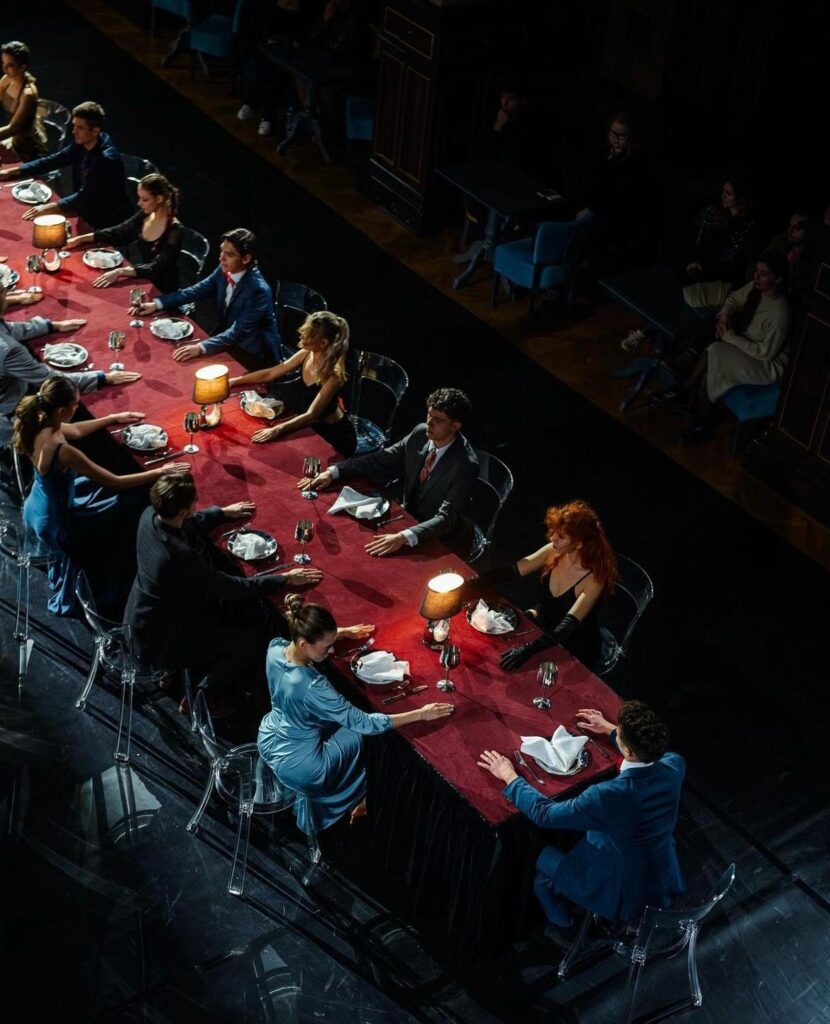 Intrăm în sală de-a dreptul neștiutori. Vedem doar o masă întinsă, unde oameni îmbrăcați de gală recurg la alcool pentru a interacționa pe cât de puțin posibil. Vă sună cunoscut? Acesta era scopul, ca fiecare să-și amintească de o experiență personală. Cei șaisprezece actori implicați în proiect, toți studenți în anul III la UNATC, știu să păstreze misterul, deși înfățișează, prin convenția dansului, acțiuni banale: beau, flirtează, bârfesc și, în final, cineva suferă. Toate sunt oglindite drept consecințe ale căderii în zona instinctuală, părăsind rațiunea și dorința de te conforma unei norme. Este greu să exprimi în cuvinte atâta dinamism, dar vă pot asigura că, într-adevăr, a fost o „fiesta” pentru ochii spectatorilor.