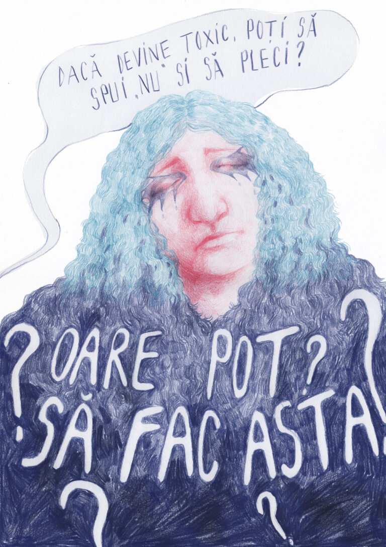 În școala generală nu mai suportam. Mi-era frică de consecințe dacă o supăram, așa că nu o mai lăsam să mă ajute. Asta m-a făcut să fiu independentă până într-un punct, dar am ajuns să nu mai las pe nimeni să-mi fie alături cu nimic. Cel mai greu e când sunt singură, vreau să mă culc, dar mi-e greu să adorm. După, îmi amintesc ce s-a întâmplat recent, stau puțin și retrăiesc teroarea, deschid ochii și repet în gând: STOP.