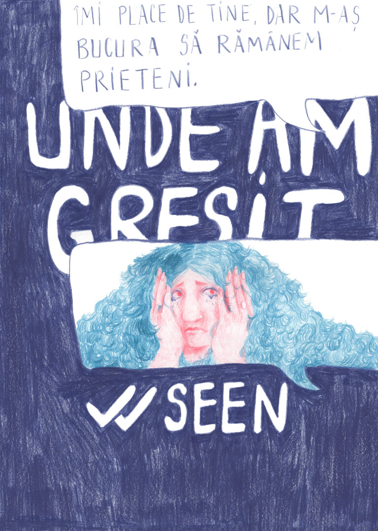 Aveam senzația că uneori conversațiile noastre se încheiau prea brusc, mă simțeam invalidată. Uneori eram lăsată în seen, mi se răspundea greu la mesaje, fapt care trezea în mine foarte multe frustrări. Am făcut ceva greșit? Am zis ceva aiurea? Ce-aș fi putut să zic ca să continuăm conversația? Nici nu cred că mă place, nu-mi dau seama de ce tot încerc. Sunt foarte enervantă și stresantă, offf, Ștefania, adună-te! Ce nașpa e că nu-mi răspunde! Oare ce face de răspunde așa greu? Când recitesc unele dintre mesajele pe care i le-am trimis în perioada respectivă, îmi vine să intru în pământ.