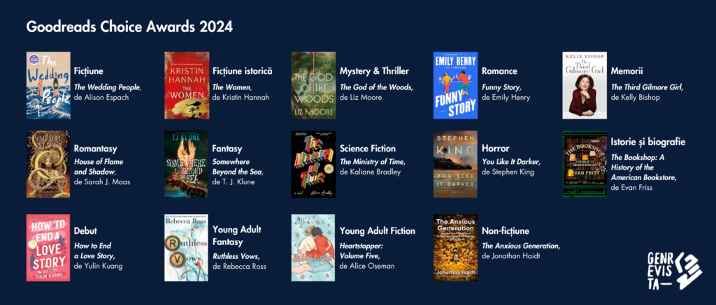 Goodreads, platformă prin intermediul căreia cititorii pot ține evidența cărților citite, lăsa recenzii cărților, căuta și găsi recenzii din partea altor cititori, organizează anual o întrecere între cărțile publicate în acel an. Cărțile sunt nominalizate pe categorii, iar cititorii pot vota favorita pentru fiecare categorie. Anul acesta au contribuit 6.2 milioane de cititori în procesul de votare, iar câștigătorii au fost: