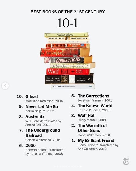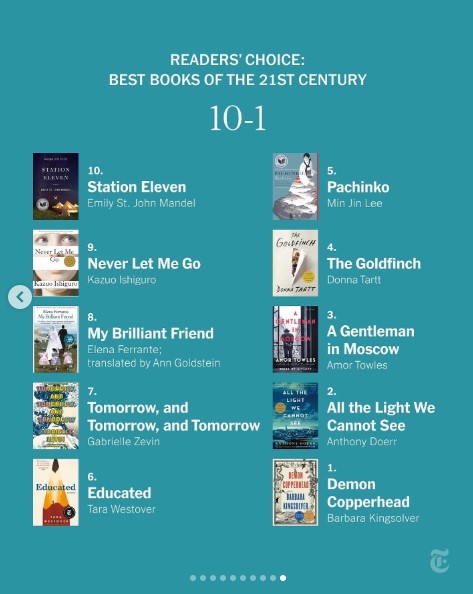 Anul acesta, The New York Times a alcătuit lista celor mai bune 100 de cărți scrise în secolul 21 cu ajutorul a 503 de scriitori, romancieri, critici literari, jurnaliști, poeți, sau persoane publice, precum Stephen King, Min Jin Lee, Anthony Doerr, Karl Ove Knausgård, Sarah Jessica Parker, Roxane Gay. A stârnit multe reacții și discuții în bulă despre limitele listei legate de ierarhizarea cărților, portretizarea predominantă a lumii vestice prin ochii scriitorilor americani, reprezentarea inegală a genurilor literare sau gradul de actualitate al cărții. Despre cărți se poate citi atent aici și aici.
