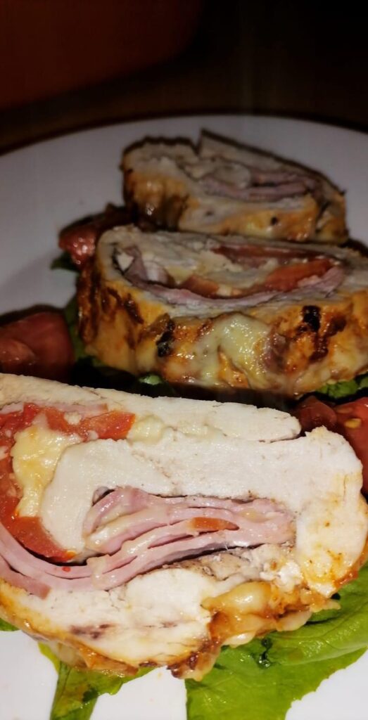 Cât timp pregătim restul, setăm cuptorul la 190 de grade și ne întoarcem la ruladă. Presărăm peste pui ce condimente dorim și așezăm peste el câteva felii de șuncă presată, felii de roșii și de cașcaval.