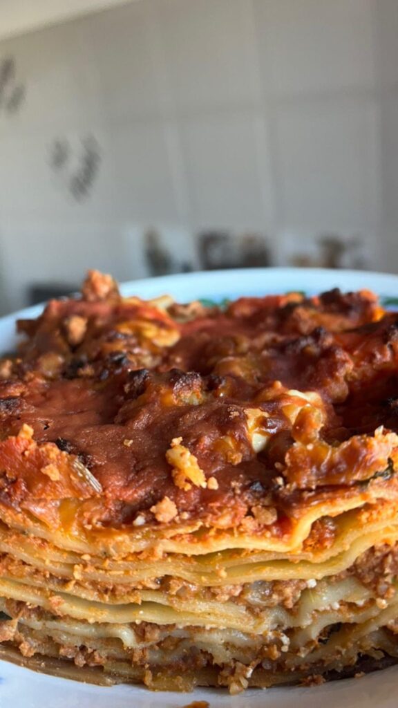 Într-o tavă de yena, așezăm un strat de carne cu sos, smântână lichidă de gătit, un rând de foi de lasagna, apoi iar sos, smântână și mozzarela. Continuăm așa până terminăm compoziția, iar la final preărăm cașcaval din belșug și introducem tava în cuptorul preîncălzit la 190 de grade pentru 40 de minute. Se taie în bucăți după ce se răcește puțin ca să nu se destrame.