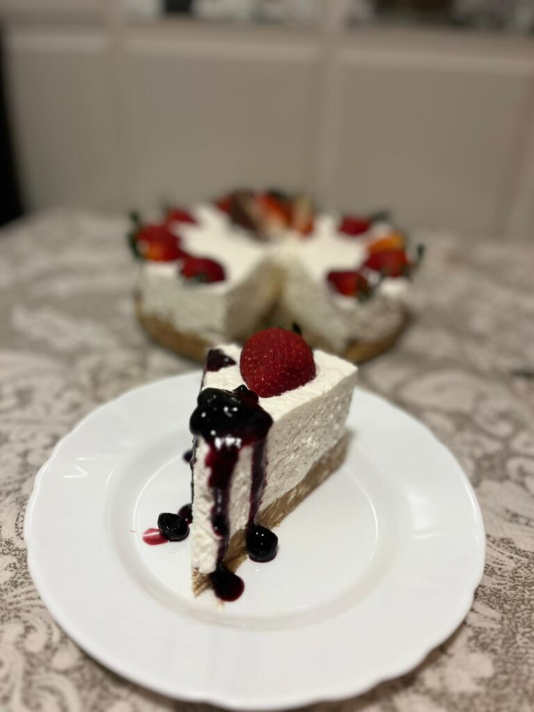 Toarnă crema peste baza de biscuiți, nivelează și lasă cheesecake-ul la frigider pentru cel puțin 4 ore sau, ideal, peste noapte. Înainte de servire, decorează-l cu dulceață și/sau fructe proaspete.