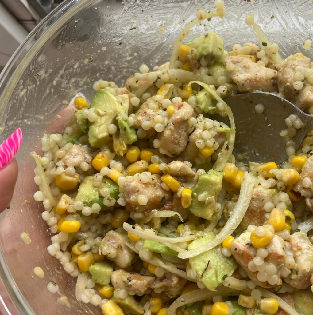 Într-un bol așezăm puiul tocat, cușcușul strecurat de apă, 2 cepe tocate solzișori, 2 avocado cubulețe și porumbul dulce dintr-o conservă de 400g. Le amestecăm bine pe toate, adăugăm zeama de la o jumătate de lămâie, sare, piper, ulei de măsline și oregano.