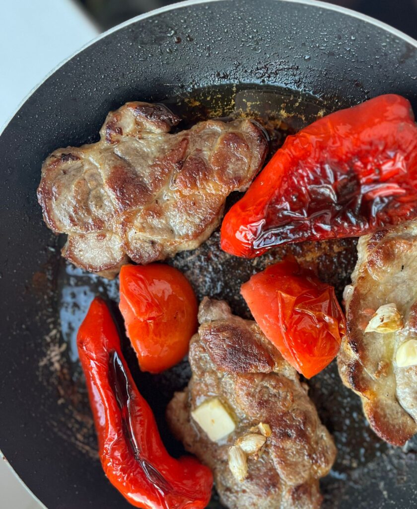 În aceeași tigaie, fără să o curățăm, punem ardeii kapia întregi și roșiile tăiate în 4. Le ținem pe foc până se înmoaie și prind culoarea de “copt”. Mie-mi place să le așez pe farfurie împreună cu un sos de iaurt, usturoi și lămâie.