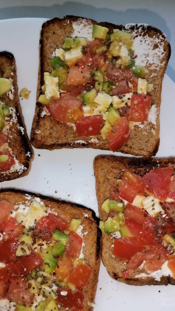 Tocăm în cubulețe 4 roșii, 3 avocado, 200 g telemea și o ceapă mare roșie(mărunt). Se asezonează cu sare, piper, lămâine și ulei aromatizat cu roșii și verdețuri, apoi se amestecă bine.