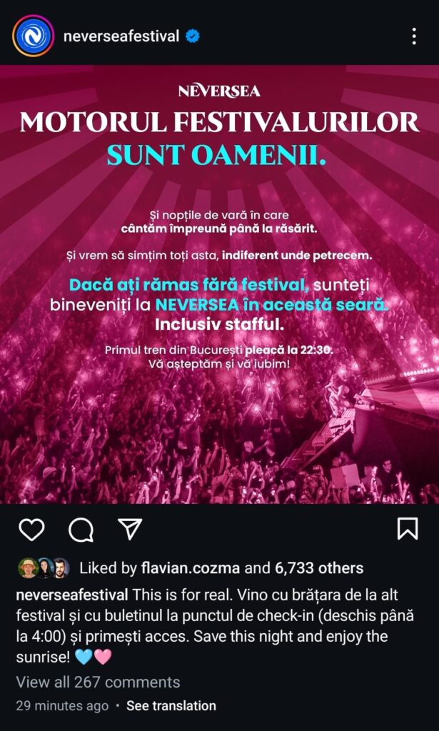 În același timp, o schemă de marketing inteligentă a venit din partea organizatorilor Neversea, care au anunțat pe contul de instagram al festivalului faptul că cei care au brățara de la festivalul SAGA, sunt primiți cu brațele deschise pentru o zi de distracție la mare, alături de artiștii prezenți la datorie.