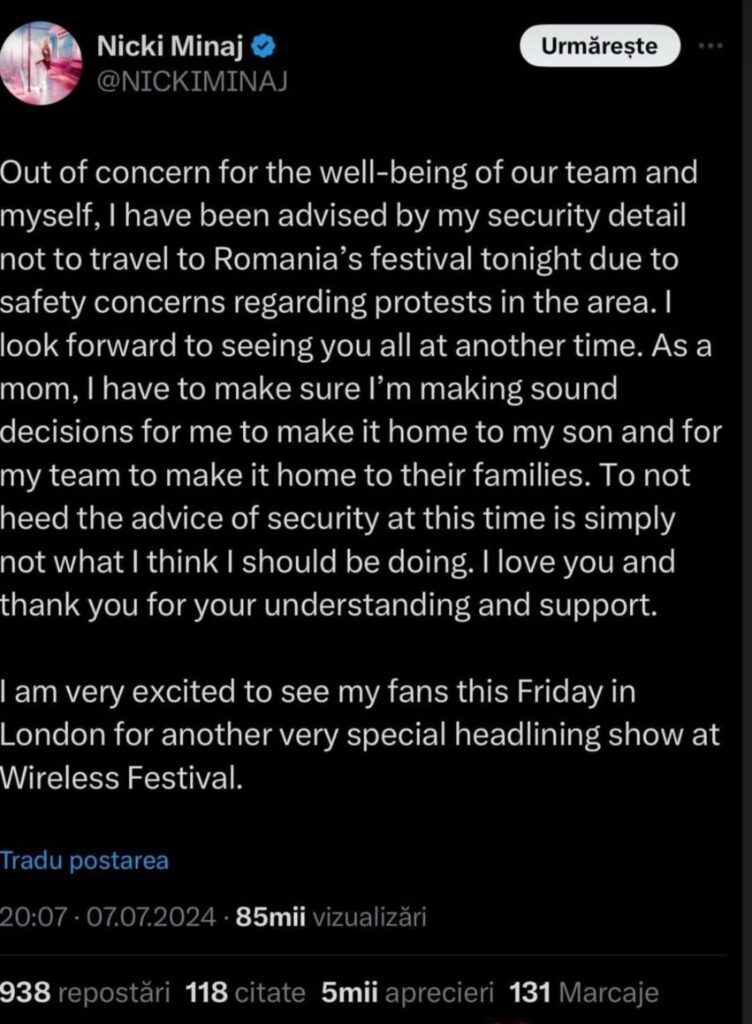 Știți ce simt cu privire la anunțul acesteia? Că e vorba despre o ipocrizie crasă, că artiștilor mari le este ușor să anuleze participări la festivaluri din România, din moment ce nu văd țările din Estul Europei cu aceeași ochi ca pe cele din Vest. Iar acest lucru reiese clar din mesajul lui Nicki de pe X, când menționează că de abia așteaptă să concerteze vineri la festivalul Wireless din Londra. E clar că echipa ei s-a chinuit să găsească cea mai plauzibilă scuză pentru ca Nicki să nu-și facă simțită prezența pe scenă și asta o simțim cu toții.