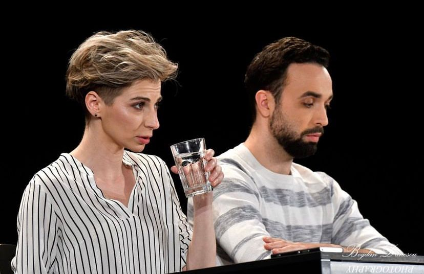 Spectacolul debutează cu Liviu Romanescu și Denisa Nicolae la o masă cu două pahare de apă. Atât. Nici nu e nevoie de mai mult. Mișcarea scenică nu începe decât mai încolo, dar nu mă pot plânge. Nu există nicio schimbare de lumina sau de decor și totuși uit de prea multe ori pe parcursul spectacolului de asta, devenind mult prea adânc cufundată în poveste ca să mai realizez că privesc un spectacol al cărui singure instrumente sunt replicile și, mai presus de atât, jocul actoricesc, și nu un film care a avut norocul de un excelent cameraman. Totul se dezvăluie de la sine în chipul cel mai firesc.