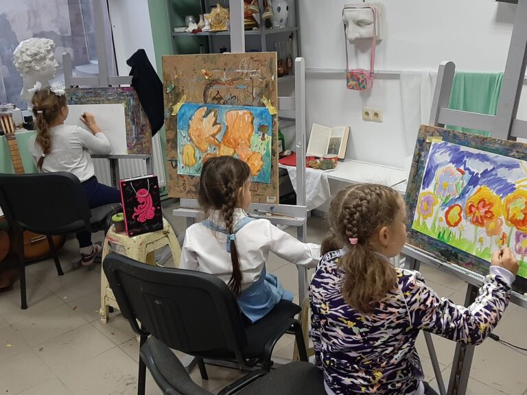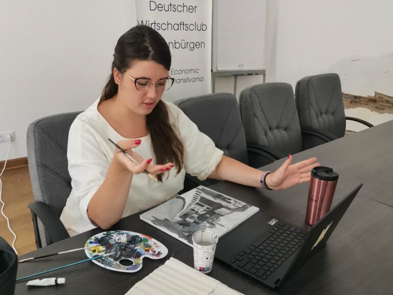 Kate Rudenko stă pe un scaun de birou în fața laptopului și vorbește despre puncte de fugă în ucraineană. În timp ce explică, finisează o pictură în alb-negru și, din când în când, ridică pânza în fața camerei pentru ca cei trei elevi ucraineni de pe Zoom să poată vedea. Își aranjează cu un tic nervos ochelarii pe care îi poartă doar când predă și glumește chiar dacă lângă ea sunt alți trei ucraineni care lucrează în spațiul comun oferit de primărie, la Centrul Ucrainean Sibiu. Sunt două săli conferințe, într-o clădire de pe strada Mitropoliei Prietena ei, Kate Spyhlazova, care e mai mică decât ea cu un an, e mult mai tăcută și stă în spatele laptopului. Face fotografii pentru pagina lor de Instagram, @fluoritstudio, prin care își promovează proiectul început înainte de război. Cele două conduc un studio de artă, care înainte avea sediul în Odesa, și unde, înainte să înceapă războiul, 100 de elevi învățau să picteze și să lucreze cu ceramică. După ce au ajuns în România, studioul nu s-a închis, ci toată munca s-a mutat pe Zoom. Au rămas doar cu zece elevi, cu care Kate R. se întâlnește săptămânal, fiindcă doar ea a continuat să predea, Kate Spyhlazova devenind manager de social media în încercarea de a găsi clienți noi. Tunsă scurt, până la umeri, aruncă o privire din când în când spre ecranul laptopului la foștii ei elevi, despre care spune că îi știe de când erau mici. În familia ei aproape toți sunt profesori, ceea ce a influențat-o să aleagă aceeași direcție. I-a plăcut dintotdeauna arta și nu s-a gândit niciodată că va ajunge să câștige bani din asta, însă părinții și o profesoară i-au spus că dacă vrea să continue să picteze și să sculpteze, singura variantă este să predea. Acum, după ce a predat cinci ani și s-a mutat în altă țară, spune că nu mai poate continua. Și-a dat seama că elevii o simțeau că nu mai are energie, iar când ajungea acasă după ore, spune că se simțea „ca o lămâie stoarsă.”