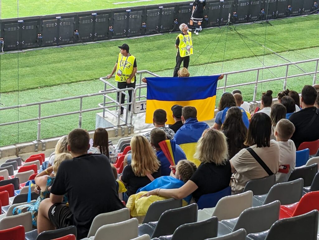De data asta am stat în peluză, ca să vedem tot stadionul, dar mai ales pentru a vedea toți suporterii din tribuna a doua, unde am stat și noi la toate celelalte meciuri de la București. La câțiva metri în fața noastră, lângă primul scaun de jos, l-am văzut pe cel mai inimos suporter ucrainean.