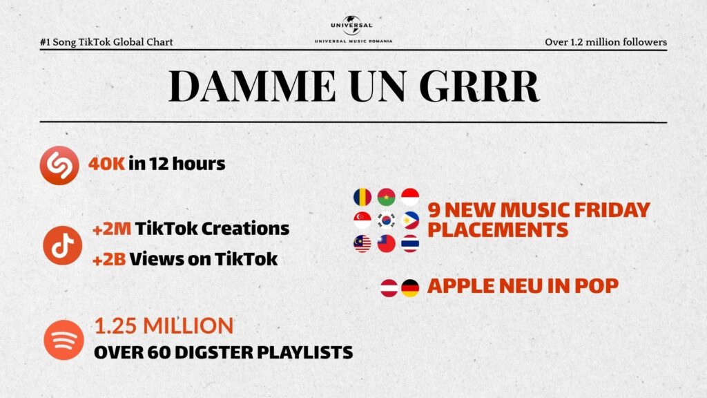 Ce face ca „Dame Un Grrr” să fie atât de eficientă ca viral? O rețetă muzicală atent calibrată pentru era scroll-ului rapid: ritmuri latino electrizante, un refren care se lipește de minte și acel „grrrr” sonor, atât de recognoscibil, care a devenit amprenta piesei. Creată de Catalina Ioana Oteleanu și Erin Danet, piesa e construită pentru viralitate, dar fără a pierde din autenticitate sau vibe muzical. Succesul nu s-a oprit la TikTok: a intrat în playlisturi internaționale de top și în ediții New Music Friday din Europa până în Asia – semn că hype-ul digital a declanșat un val global.