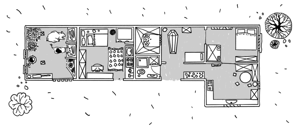 Casele de la țară au structura perfectă pentru priveghiul mortului. În primul rând, casa de la țară e formată din două case: căsuța, perete în perete cu grajdul, unde își mai pune omul și un pat, un televizor, bibelouri peste ștergare, de o face numai bună de stat, și casa mare. În casa mare omul intră cel mai adesea cu picioarele înapoi. Te întâmpină un hol mic care dă spre trei camere: o bucătărie nou-nouță unde nu te lasă inima să gătești, un probabil dormitor care e mereu încuiat și poate e mai bine așa, iar la final, față în față cu ușa, popesește sufrageria nemuririi sufletelor. Prin acele locuri sufrageria are termenul popular de „ceiacasă”, probabil o prescurtare de la mult prea lunga: „cealaltă casă”, dar despre asta o să vorbim în viitor în „Soborul cuvintelor care nu există”, o lucrare personală care n-o să existe niciodată. În holul micuț încape perfect o masă în partea dreaptă de unde iei lumânarea de la o rudă mai îndepărtată, pășești spre sufragerie, pui bani pe mort, îi zici văduvei: „parcă doarme”, o nepoată îndurerată iese din bucătăria nouă cu o tavă cu vișinată și suc ieftin, o alta vine cu o fructieră cu prăjituri de care ți-e greu să te atingi, dar cum nu se cuvine să refuzi, iei o prăjitură pe care o ții în mână până se topește tot zahărul din ea, aștepți să ieși din perimetrul ogradei, o arunci la gârlă și-ți ștergi zahărul de haina neagră de pe tine.