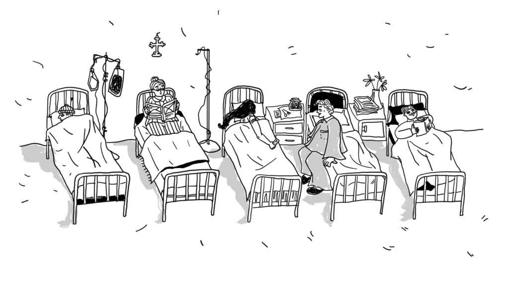Tolerez diminețile, cu lucrători de șantiere ce-și beau cafeaua de la automat și caută cu privirea prezența rară a fetelor adormite de pe stradă, lăzile de pâine ce se zguduie pe podelele magazinelor mixte, vecini ce se salută răcnind, câini prea adormiți ca să te mai latre. Le tolerez chiar și pe cele de vară, care, în orașul cu pricina, îți impunea piloerecția de pe brațele goale. La 8 dimineața trebuia să fiu la spital. Ca să fac o impresie bună am ajuns cu 10 minute mai devreme, nu cu 20 cum îmi plăcea să-mi dezmierd punctualitatea de obicei. Am dat iar cu ochii de infirmiera de la intrare care era deja sătulă de mine de parcă merseserăm împreună cu personalul de la București la Satu Mare; am urcat un etaj și am căutat oameni sau ce mai rămăsese din ei. Ca într-o reclamă de Crăciun, mirosul de cafea m-a dus spre sala de tratament, unde m-au întâmpinat cu un zâmbet ce-și păstra decența artificialului, asistenta șefă, A., și un alt cârd de oameni ce aveam să-i cunosc mai mult sau mai puțin. M-au trimis în vestiar, mi-am lăsat lucrurile și mi-am tras un halat pe mine, întorcându-mă cu altă identitate spre sala de tratament. La ușă, oameni în pijamale și capoate, cu căni în mâini, formau o coadă domoală și negrăbită. Am trecut pe lângă ei scuzându-mă, fără să fiu privită cu prea mult interes, acolo, o asistentă aspră le deschidea gura pacienților, să fie sigură că nimenea nu ratează tratamentul. Mulți se plângeau că-și doresc ceva mai tare pentru somn, alții, prin eleganțe neașteptate, se sustrăgeau politicos de la ele, acceptau vitaminele, dar nu era nicio cale de înduplecare, așa că se întorceau spre saloane lor cu limbile ridicate și moralul la pământ.