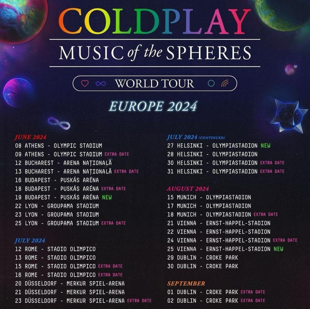 - Coldplay – Trupa de rock din UK se află în al optulea lor turneu, pe care îl vor aduce la vară și în România, pe Arena Națională, în București. Pentru a putea să-și promoveze cât mai bine noul album ,,Music of The Spheres”, artiștii au anunțat concertul chiar cu o zi înainte de a-l lansa. Membrii trupei s-au întors pe scenă după o pauză destul de lungă, dorindu-și ca spectacolele lor să fie cât mai puțin dăunătoare pentru natură. Astfel, în momentul în care au anunțat turneul, membrii trupei au făcut public și un plan cu 12 pași, prin care să reducă emisiile de dioxid de carbon cu 50% comparativ cu ultimul lor turneu ,,A Head Full of Dreams” din 2016-2017. Planul a fost dezvoltat pe parcursul a doi ani de către experți în mediu. Unele emisii sunt inevitabile când vine vorba de un concert, însă Coldplay au reușit să-și susțină spectacole cu resurse regenerabile și au promis că vor planta un copac pentru fiecare bilet vândut, printr-un acord cu One Tree Planted, iar efectele speciale folosite de aceștia sunt cât se poate de eco-friendly. Aceștia aveau planificat spectacolul din România pe data de 12 iunie, dar datorită cererii mari de bilete, au decis să petreacă mai mult timp în țară, adăugând și 13 iunie ca zi de concert.